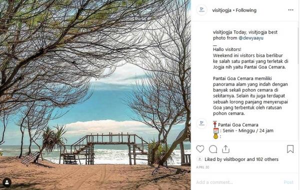 "Hallo visitors! Weekend ini visitors bisa berlibur ke salah satu pantai yang terletak di Yogyakarta nih, yaitu Pantai Gua Cemara. Pantai Gua Cemara memiliki panorama alam yang indah dengan banyak sekali pohon cemara di sekitarnya. Selain itu, terdapat sebuah lorong panjang menyerupai Goa yang terbentuk oleh ratusan pohon cemara," tulis Instagram @Visitjogja, dikutip Kamis (9/5/2019).