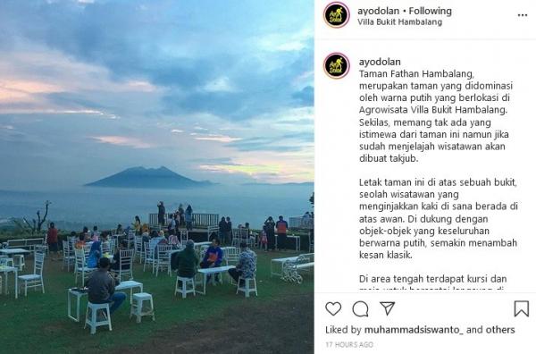 "Taman Fathan Hambalang, merupakan taman yang didominasi oleh warna putih yang berlokasi di Agrowisata Villa Bukit Hambalang. Sekilas, memang tak ada yang istimewa dari taman ini namun jika sudah menjelajah wisatawan akan dibuat takjub. Foto dolan dari @mfm_ihsan" tulis Instagram @ayodolan, dikutip Rabu (18/3/2020).