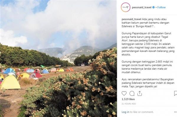 "Ada yang rindu atau bahkan belum pernah bertemu dengan edelweiss si bunga abadi? Gunung Papandayan di Kabupaten Garut punya harta karun yang disebut Tegal Alun. Berupa padang edelweis di ketinggian sekitar 2.500 mdpl. Ini adalah salah satu magnet bagi para pendaki, selain pemandangan kawah-kawah belerang yang eksotis. Gunung dengan ketinggian 2.665 mdpl ini sangat cocok buat kamu pendaki pemula, karena medannya landai dan mata air mudah ditemui. Ayo, rencanakan pendakianmu! Bayangkan padang edelweis terhampar indah di depan mata. Tapi, jangan dipetik, ya!," tulis Instagram @pesonaid_travel, dikutip Minggu (7/4/2019).