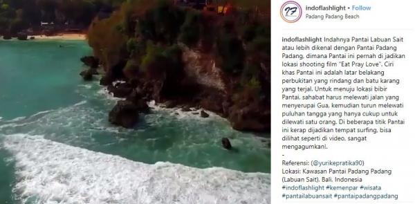 "Indahnya Pantai Labuan Sait atau lebih dikenal dengan Pantai Padang Padang, di mana Pantai ini pernah dijadikan lokasi shooting film Eat Pray Love. Ciri khas Pantai ini adalah latar belakang perbukitan yang rindang dan batu karang yang terjal. Untuk menuju lokasi bibir pantai, sahabat harus melewati jalan yang menyerupai gua, kemudian turun melewati puluhan tangga yang hanya cukup untuk dilewati satu orang. Di beberapa titik, pantai ini kerap dijadikan tempat surfing, bisa dilihat seperti di video, sangat mengagumkan!," tulis Instagram @yurikepratika90, dikutip @indoflashlight, Rabu (3/10/2018).