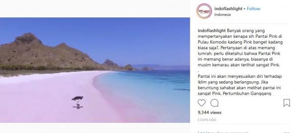 "Banyak orang yang mempertanyakan kenapa sih Pantai Pink di Pulau Komodo kadang Pink banget kadang biasa saja? Pertanyaan di atas memang lumrah, perlu diketahui Pantai Pink ini memang benar adanya, biasanya di musim kemarau akan terlihat sangat Pink. Pantai ini akan menyesuaikan diri terhadap iklim yang sedang berlangsung. Jika beruntung, sahabat akan melihat pantai ini sangat Pink. Pertumbuhan Ganggang merah di pantai ini sangat berperan dalam distribusi warna Pink, karena sejatinya pantai ini bukan pasirnya yang berwarna Pink tapi endapan karang, ganggang dan tumbuhan laut lainnya yang membaur sehingga terlihat berwarna Pink. Yang jelas, ini alam Indonesia yang patut kita semua banggakan dan tentunya dilestarikan. Kalau di video ini memang tidak diedit warna Pink-nya, sangat natural. Wonderful Indonesia," tulis Instagram @Indoflashlight, dikutip Selasa (28/8/2018).