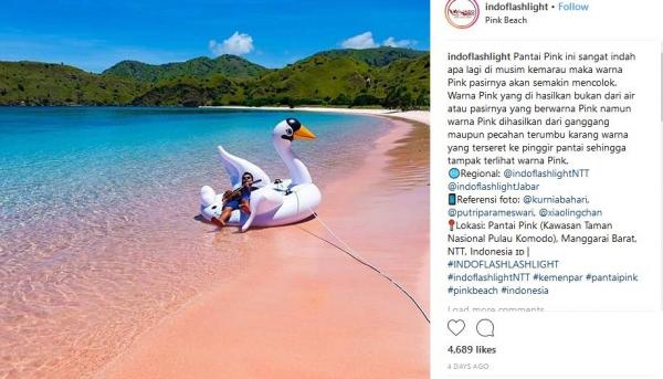 "Pantai Pink ini sangat indah apa lagi di musim kemarau maka warna Pink pasirnya akan semakin mencolok. Warna Pink yang dihasilkan bukan dari air atau pasirnya yang berwarna Pink namun warna Pink dihasilkan dari ganggang maupun pecahan terumbu karang warna yang terseret ke pinggir pantai, sehingga tampak terlihat warna Pink," tulis Instagram @indoflashlight, dikutip Senin (16/7/2018).