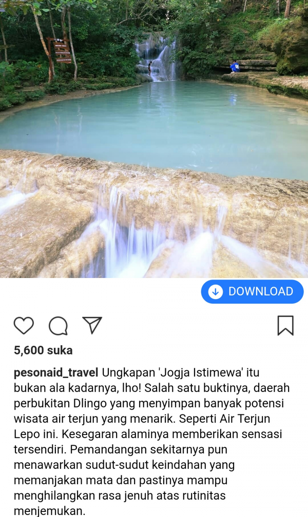 "Ungkapan 'Yogya Istimewa' itu bukan ala kadarnya, lho! Salah satu buktinya, daerah perbukitan Dlingo yang menyimpan banyak potensi wisata air terjun yang menarik. Seperti Air Terjun Lepo ini. Kesegaran alaminya memberikan sensasi tersendiri. Meskipun terlihat tenang, Anda tetap harus berhati-hati, karena kolam besar ini cukup dalam. Fasilitas penunjang wisata Air Terjun Lepo sudah cukup lengkap. Jadi, tak perlu ragu bila ingin ke sini. Yuk, ajak temanmu!" tulis Instagram @pesonaid_travel, dikutip Minggu (4/8/2019).