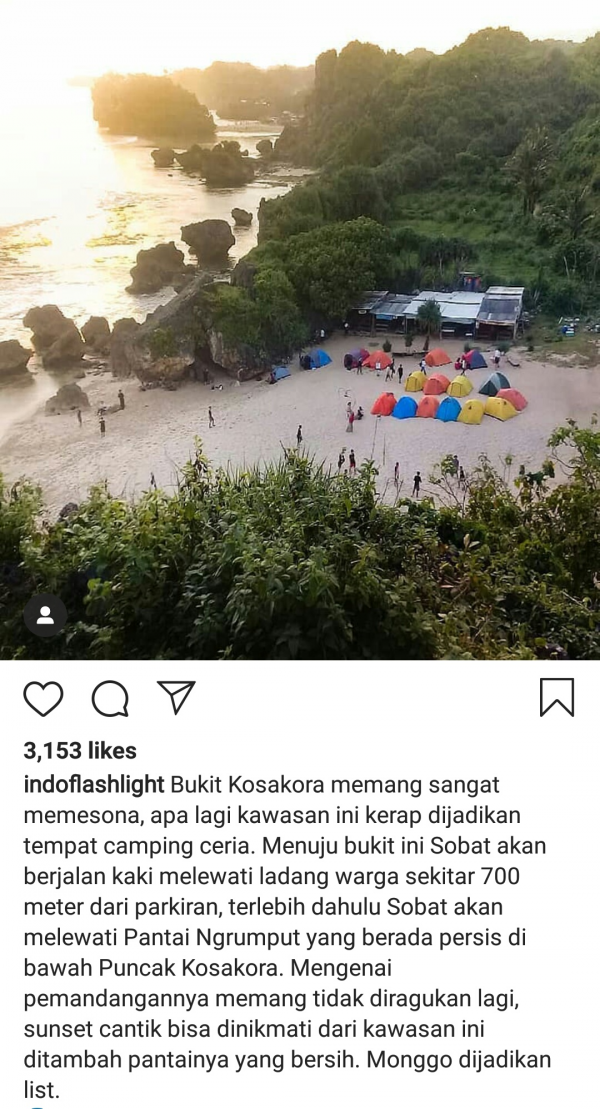 "Bukit Kosakora memang sangat memesona. Kawasan ini kerap dijadikan tempat camping ceria. Menuju bukit ini, Anda akan berjalan kaki melewati ladang warga sekitar 700 meter dari parkiran. Sebelumnya, Anda harus melewati Pantai Ngrumput yang berada persis di bawah Puncak Kosakora. Keindahan Bukit Kosakora memang tak perlu diragukan lagi. Sunset cantik bisa dinikmati dari kawasan ini, ditambah pantainya yang bersih. Monggo dijadikan list. Referensi foto: (@kosakorahill)," tulis Instagram @indoflashlight, dikutip Sabtu (20/7/2019).