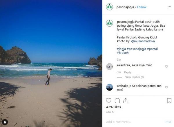 "Pantai pasir putih ini terletak paling ujung timur Kota Yogyakarta. Jika ingin ke sini bisa lewat Pantai Sadeng. Namanya Pantai Krokoh, lokasinya di Gunungkidul. Photo by: @muhanmadriva," tulis Instagram @pesonajogja, dikutip Rabu (10/7/2019).
