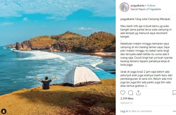 "Buat kamu yang suka pantai dan camping, ada tempat yang recomended banget. Kebetulan malam minggu kemaren saya camping di sini bareng teman. Saya pikir malam minggu itu bakal rame banget. Ternyata salah, saat itu cuma ada enam orang. Cocok banget buat santai bareng teman lepasin penatnya kerja di Kota Yogyakarta," tulis Instagram @yogyakarta, dikutip Minggu (17/3/2019).