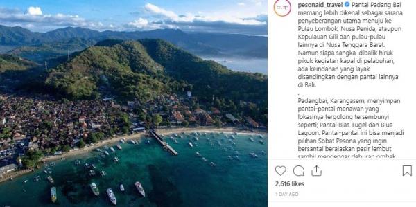 "Pantai Padang Bai memang lebih dikenal sebagai sarana penyeberangan utama menuju ke Pulau Lombok, Nusa Penida, ataupun Kepulauan Gili dan pulau-pulau lainnya di Nusa Tenggara Barat. Namun siapa sangka, di balik hiruk pikuk kegiatan kapal di pelabuhan, ada keindahan yang layak disandingkan dengan pantai lain di Bali. Padangbai, Karangasem, menyimpan pantai-pantai menawan yang lokasinya tergolong tersembunyi seperti; Pantai Bias Tugel dan Blue Lagoon. Pantai-pantai ini bisa menjadi pilihan Sobat Pesona yang ingin bersantai beralaskan pasir lembut sambil mendengar deburan ombak. Tak hanya itu, bebatuan karang yang cantik, hamparan pasir putih dan laut biru nan jernih, semua bisa kita temukan di Padangbai. Tunggu apalagi? Padangbai menanti untuk dikunjungi," tulis Instagram @pesonaid_travel, dikutip Senin (28/10/2019).