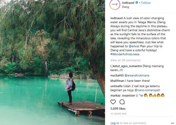 "Pemandangan indah dari air yang berubah warna menanti Anda di Telaga Warna, Dieng. Datang siang hari di dataran tinggi ini, Anda akan menemukan pesona khas Jawa Tengah saat sinar matahari jatuh ke permukaan danau. Ini akan mengungkapkan warna ajaib yang akan membuat Anda tak bisa berkata-kata. Rencanakan perjalanan Anda ke Dieng dan nikmati liburan penuh warna!," tulis Instagram Indtravel, dikutip iNews.id, Kamis (17/5/2018).