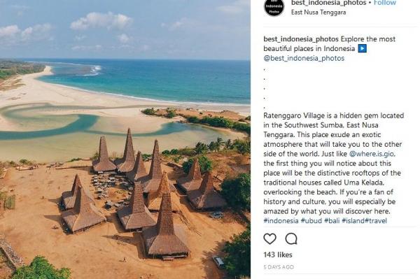 "Desa Ratenggaro adalah permata tersembunyi yang terletak di Sumba Barat Daya, Nusa Tenggara Timur. Tempat ini memancarkan suasana eksotis yang akan membawamu ke sisi lain dunia. Persis seperti @where.is.gio, hal pertama yang akan Anda perhatikan tentang tempat ini adalah atap khas rumah-rumah tradisional yang disebut Uma Kelada, menghadap ke pantai. Jika penggemar sejarah dan budaya, Anda akan kagum dengan apa yang ditemukan di sini," tulis Instagram BestIndonesia, seperti dikutip iNews.id, Kamis (3/5/2018).