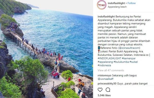 "Berkunjung ke Pantai Appalarang, Bulukumba maka sahabat akan disambut hamparan tebing memanjang yang megah. Appalarang sendiri merupakan sebuah pantai yang tidak memiliki pesisir. Namun, yang membuat pantai ini menarik adalah dataran perbukitan hijau di pinggir pantai ditambah dengan coraknya yang cukup eksotis," tulis Instagram @indoflashlight, Senin (2/7/2018).