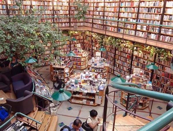 Meksiko Cafebreria El Pendulo adalah sebuah oase. Anda harus mencoba menghabiskan waktu membaca di tempat ini. Tempat ini memiliki kantai di lantai pertama, tempat santai dengan sofa-sofa di lantai dua, dan sebuah bar di lantai tiga. Setiap ruangan dihiasi dengan pemandangan tanaman yang hijau dan subur. Seluruh ruang terinspirasi alam yang membuat toko ini begitu menenangkan dan cantik.