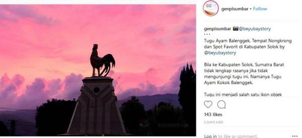 "Bila ke Kabupaten Solok, Sumatera Barat tidak lengkap rasanya jika tidak mengunjungi tugu ini. Namanya Tugu Ayam Kokok Balenggek. Tugu ini menjadi salah satu ikon objek wisata yang berlokasi di jalan lintas Solok-Padang km 24 Arosuka. Tugu berada persis di segi tiga persimpangan rumah dinas bupati dan komplek perkantoran pemerintah Kabupaten Solok," tulis Instagram, @GenpiSumbar, dikutip Kamis (12/7/2018).