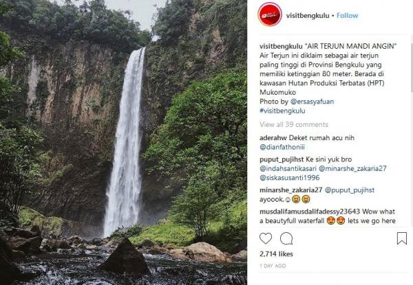 "Air Terjun ini diklaim sebagai air terjun paling tinggi di Provinsi Bengkulu yang memiliki ketinggian 80 meter. Berada di kawasan Hutan Produksi Terbatas (HPT) Mukomuko," tulis Instagram Visit Bengkulu, dikutip Selasa (7/8/2018).