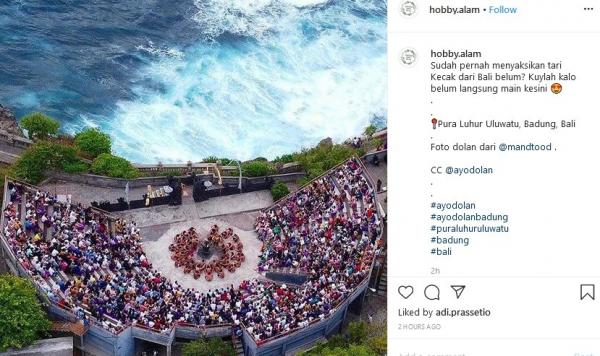"Sudah pernah menyaksikan tari Kecak dari Bali belum? Kuylah kalo belum langsung main ke sini. Pura Luhur Uluwatu, Badung, Bali. Foto dolan dari @mandtood," tulis Instagram @hobby.alam, dikutip Senin (16/3/2020).