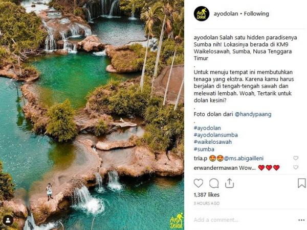 "Salah satu hidden paradisenya Sumba nih! Lokasinya berada di KM9 Waikelo Sawah, Sumba, Nusa Tenggara Timur. Untuk menuju tempat ini membutuhkan tenaga yang ekstra. Karena kamu harus berjalan di tengah-tengah sawah dan melewati lembah. Woah, Tertarik untuk dolan ke sini? Foto dolan dari @handypaang," tulis Instagram @ayodolan dikutip Rabu (13/2/2019).