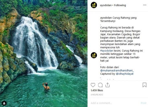 "Curug Rahong yang Tersembunyi. Curug Rahong ini berada di Kampung Kedaung, Desa Rengas Jajar, Kecamatan Cigudeg, Bogor bagian utara. Daerah yang dekat perbatasan Banten ini juga menyimpan keindahan alam yang memesona. Ayo dolan ke sini. Curug Rahong ini memiliki ketinggian sekitar 15 meter, untuk ke sini tetap berhati-hati, ya!" tulis Instagram @ayodolan, dikutip Minggu (14/4/2019).