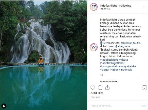 "Curug Lembah Pelangi, di mana sekitar area bawahnya terdapat kolam renang. Sobat bisa berkunjung ke tempat wisata ini untuk melepas penat atau refereshing dari kesibukan sehari-hari," tulis Instagram @Indoflashlight, dikutip Sabtu (11/6/2019).