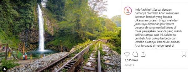 "Sesuai namanya, Lembah Anai merupakan kawasan lembah yang berada di kawasan dataran tinggi melintasi jalan raya. Jalur kereta bersejarah yang menjadi akses di masa penjajahan Belanda juga masih terlihat sampai saat ini. Selain itu, Lembah Anai berbeda dari lembah biasanya, terdapat air terjun tepat di pinggir jalan. Hal inilah yang menjadi daya tarik sekaligus menjadikan air terjun ini salah satu yang tereksotis di Indonesia. Referensi foto: @wiraseto," tulis Instagram @Indoflashlight, Kamis (15/8/2019).