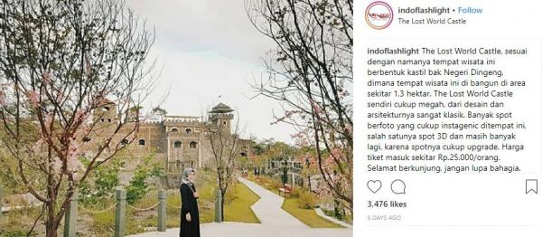 "The Lost World Castle, sesuai dengan namanya, tempat wisata ini berbentuk kastil bak Negeri Dongeng, di mana tempat wisata ini dibangun di area sekitar 1,3 hektare. The Lost World Castle sendiri cukup megah. Desain dan arsitekturnya sangat klasik. Banyak spot berfoto yang cukup instagenic di tempat ini, salah satunya spot 3D dan masih banyak lagi, karena spotnya cukup upgrade. Harga tiket masuk sekitar Rp25.000/orang. Selamat berkunjung, jangan lupa bahagia," tulis pemilik akun Instagram @indoflashlight, dikutip Jumat (27/7/2018).