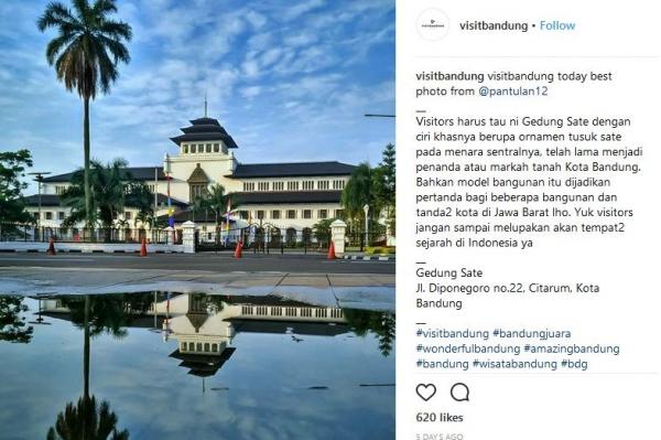 "Visitors harus tahu Gedung Sate dengan ciri khasnya berupa ornamen tusuk sate pada menara sentralnya. Ornamen ini telah lama menjadi penanda atau markah tanah Kota Bandung. Bahkan model bangunan itu dijadikan pertanda bagi beberapa bangunan dan tanda-tanda kota di Jawa Barat lho. Yuk visitors jangan sampai melupakan tempat-tempat sejarah di Indonesia ya," tulis Instagram @pantulan12, dikutip iNews.id, Selasa (29/5/2018).