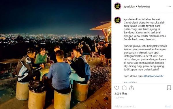 "Punclut alias Puncak Ciumbuleuit Utara termasuk salah satu tujuan wisata favorit para pelancong saat berkunjung ke Bandung. Kawasan ini terkenal dengan kedai-kedai makanan khas Sunda berkonsep lesehan. Punclut punya satu kompleks wisata kuliner yang menawarkan beragam panganan, rekreasi, dan spot Instagramable. Sederet kafe dan resto dengan pemandangan keren di sana siap menawarkan konsep sky dining bagi para pengunjung. Jadi kapan mau dolan kesini? Foto dolan dari @hadiwibowo87," tulis Instagram @ayodolan, dikutip Jumat (18/10/2019).
