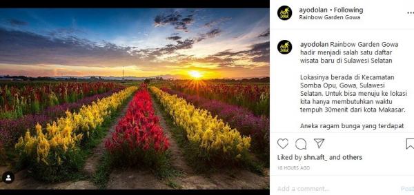 "Rainbow Garden Gowa hadir menjadi salah satu daftar wisata baru di Sulawesi Selatan. Lokasinya berada di Kecamatan Somba Opu, Gowa, Sulawesi Selatan. Untuk bisa menuju ke lokasi kita hanya membutuhkan waktu tempuh 30 menit dari kota Makasar. Aneka ragam bunga yang terdapat di sini menjadi daya tarik wisatawan. Hanya dengan membayar harga tiket sebesar 10k, kita bisa berfoto sepuasnya di Rainbow Garden ini," tulis Instagram @ayodolan, dikutip Kamis (9/1/2020).