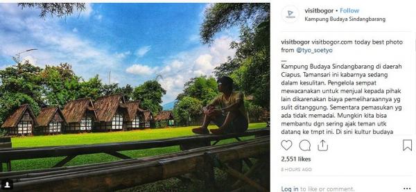 "Kampung Budaya Sindangbarang di daerah Ciapus, Tamansari ini kabarnya sedang dalam kesulitan. Pengelola sempat mewacanakan untuk menjual kepada pihak lain dikarenakan biaya pemeliharaannya yang sulit ditanggung. Sementara, pemasukan yang ada tidak memadai. Mungkin kita bisa membantu dengan sering ajak teman untuk datang ke tempat ini. Di sini kultur budaya Sunda Bogor bisa kita lihat dalam kehidupan sehari-hari," tulis Instagram, @VisitBogor, dikutip Senin (10/9/2018).