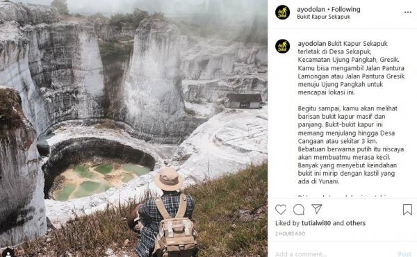 "Bukit Kapur Sekapuk terletak di Desa Sekapuk, Kecamatan Ujung Pangkah, Gresik. Kamu bisa mengambil Jalan Pantura Lamongan atau Jalan Pantura Gresik menuju Ujung Pangkah untuk mencapai lokasi ini. Begitu sampai, kamu akan melihat barisan bukit kapur masif dan panjang. Bukit-bukit kapur ini memang menjulang hingga Desa Cangaan atau sekitar 3 km. Bebatuan berwarna putih itu niscaya akan membuatmu merasa kecil. Banyak yang menyebut keindahan bukit ini mirip dengan kastil yang ada di Yunani," tulis Instagram @ayodolan, dikutip Rabu (8/1/2020).