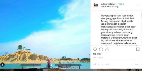 "Bukit Pasir Bintan atau yang juga disebut Bukit Pasir Busung merupakan objek wisata yang kini tengah populer, menawarkan keindahan bukit pasir layaknya di timur tengah berupa gundukan pasir yang merona ketika terkena sinar matahari. Untuk berkunjung ke bukit ini, setidaknya wisatawan harus menempuh perjalanan selama satu jam dengan jarak tempuh sekitar 50 kilometer dari Kota Tanjung Pinang, Bukit Pasir Bintan ini memang tidak tercipta secara alami, namun dulunya merupakan tempat penambangan pasir yang cukup produktif, bahkan pasir hasil tambang juga diekspor hingga ke mancanegara. Berselang beberapa waktu, terciptalah gundukan-gundukan pasir yang menjadi fenomena tersendiri serta mengundang banyak orang yang tengah melewati Jalan Tanjung Pinang - Bintan #IGS_Riau," tulis Instagram @Indogreatspot, dikutip Jumat (29/3/2019).