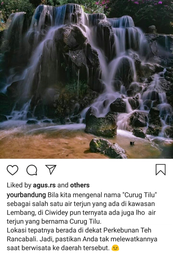 "Bila kita mengenal nama Curug Tilu sebagai salah satu air terjun yang ada di kawasan Lembang, di Ciwidey pun ternyata ada juga lho air terjun yang bernama Curug Tilu. Lokasi tepatnya berada di dekat Perkebunan Teh Rancabali. Jadi, pastikan Anda tak melewatkannya saat berwisata ke daerah tersebut," tulis Instagram @yourbandung, Rabu (4/12/2019).