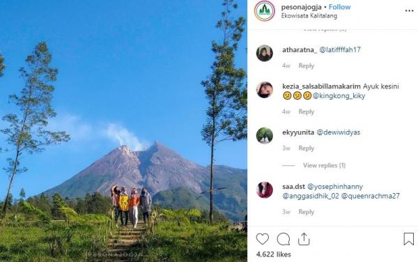 "Puncak Merapi tampak jelas dari objek wisata ini. Datanglah pagi hari, biasanya Merapi menampakan kegagahanya. Ekowisata Kali Talang, Balerante, Kemalang, Klaten, Jawa Tengah," tulis Instagram @pesonajogja, Jumat (31/5/2019).