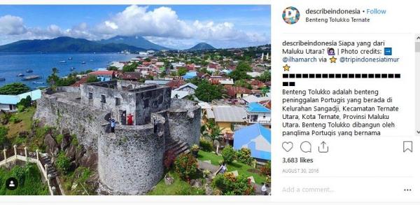 "Siapa yang dari Maluku Utara?Photo credits: @ilhamarch via tripindonesiatimur. Benteng Tolukko adalah benteng peninggalan Portugis yang berada di Kelurahan Sangadji, Kecamatan Ternate Utara, Kota Ternate, Provinsi Maluku Utara. Benteng Tolukko dibangun oleh panglima Portugis yang bernama Fransisco Serao, pada tahun 1540. Benteng ini dibangun Portugis sebagai pertahanan dalam menguasai cengkih dan juga menguasai dominasinya di antara bangsa Eropa lain. Benteng ini kemudian diambil alih oleh Belanda pada tahun 1610-an dan direnovasi oleh Pieter Both. Pemerintah Republik Indonesia memugar benteng ini pada tahun 1996-1997," tulis Instagram @describeindonesia, dikutip Senin (11/3/2019).