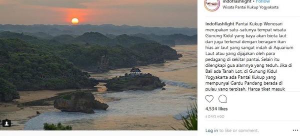 "Pantai Kukup Wonosari merupakan satu-satunya tempat wisata Gunung Kidul yang kaya akan biota laut. Juga terkenal dengan beragam ikan hias air laut yang sangat indah di Aquarium Laut atau yang dijajakan oleh para pedagang di sekitar pantai. Selain itu dilengkapi gua alamnya yang teduh. Jika di Bali ada Tanah Lot, di Gunung Kidul Yogyakarta ada Pantai Kukup yang mempunyai Gardu Pandang berada di pulau yang terpisah. Harga tiket masuk Rp10.000. Selamat berkunjung," tulis Instagram @indoflashlight, dikutip Selasa (3/7/2018).