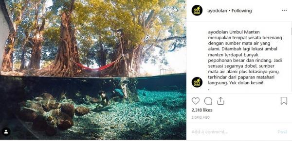 "Umbul Manten merupakan tempat wisata berenang dengan sumber mata air yang alami. Ditambah lagi, di lokasi Umbul Manten terdapat banyak pepohonan besar dan rindang. Jadi sensasi segarnya dobel, sumber mata air alami plus lokasinya yang terhindar dari paparan matahari langsung. Yuk, dolan ke sini!," tulis Instagram @ayodolan, dikutip Selasa (23/4/2019).