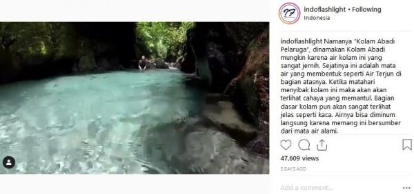 "Namanya Kolam Abadi Pelaruga, dinamakan Kolam Abadi mungkin karena air kolam ini yang sangat jernih. Sejatinya ini adalah mata air yang membentuk seperti air terjun di bagian atasnya. Ketika matahari menyibak kolam ini, maka akan terlihat cahaya yang memantul. Bagian dasar kolam pun akan sangat terlihat jelas seperti kaca. Airnya bisa diminum langsung karena memang ini bersumber dari mata air alami," tulis Instagram @Indoflashlight, dikutip Jumat (8/2/2019).