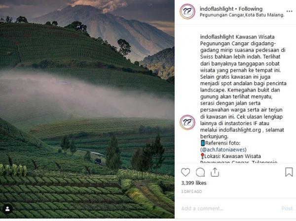 "Kawasan Wisata Pegunungan Cangar digadang-gadang mirip suasana pedesaan di Swiss bahkan lebih indah. Terlihat dari banyaknya tanggapan sobat wisata yang pernah ke tempat ini. Selain gratis, kawasan ini juga menjadi spot andalan bagi pencinta landscape. Kemegahan bukit dan gunung akan terlihat menyatu, serasi dengan jalan serta persawahan warga serta air terjun di kawasan ini," tulis Instagram @Indoflashlight dikutip Sabtu (6/4/2019).