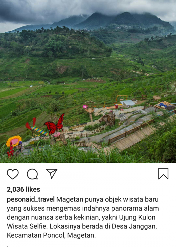 JAKARTA, iNews.id - Magetan punya objek wisata baru yang sukses mengemas indahnya panorama alam dengan nuansa serba kekinian. Namanya Ujung Kulon Wisata Selfie. Lokasinya berada di Desa Janggan, Kecamatan Poncol, Magetan.