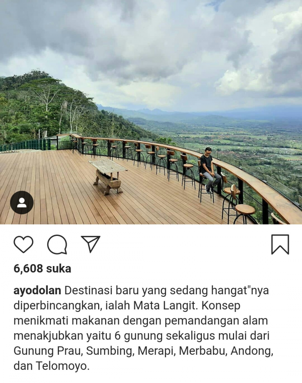 "Destinasi baru yang sedang hangat-hangatnya diperbincangkan, ialah Mata Langit. Konsep menikmati makanan dengan pemandangan alam menakjubkan yaitu 6 gunung sekaligus mulai dari Gunung Prau, Sumbing, Merapi, Merbabu, Andong, dan Telomoyo," tulis Instagram @ayodolan, dikutip Sabtu (18/1/2020).