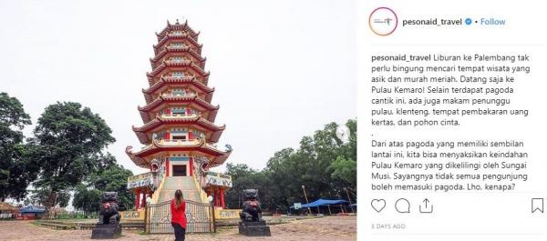 "Liburan ke Palembang tak perlu bingung mencari tempat wisata yang asyik dan murah meriah. Datang saja ke Pulau Kemaro! Selain terdapat Pagoda cantik ini, ada juga makam penunggu pulau, klenteng, tempat pembakaran uang kertas, dan pohon cinta. Dari atas Pagoda yang memiliki sembilan lantai ini, kita bisa menyaksikan keindahan Pulau Kemaro yang dikelilingi oleh Sungai Musi. Sayangnya tidak semua pengunjung boleh memasuki pagoda. Lho, kenapa?," tulis Instagram Pesonaid_Travel, Selasa (27/11/2018).