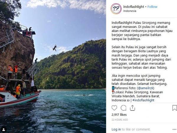 "Pulau Sironjong memang sangat menawan. Di pulau ini sahabat akan melihat rimbunnya pepohonan hijau berjejer sepanjang pantai bahkan sampai ke bukitnya. Selain itu Pulau ini juga sangat bersih dengan beragam biota lautnya yang masih terjaga. Dan yang menjadi daya tarik Pulau ini, adanya spot jumping dari ketinggian, sahabat akan merasakan sensasi terjun bebas dari atas tebing. Jika ingin mencoba spot jumping, sahabat dapat menaiki tangga yang telah disediakan. Selamat berkunjung," tulis Instagram @Indoflashlight dikutip Selasa (8/1/2019).