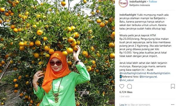 "Yukk mumpung masih ada jeruknya silahkan mampir ke Balitjestro - Batu, karena panennya hanya setahun sekali dan terbuka untuk umum. Kalau jeruknya sudah habis ditutup lagi. Wisata petik jeruk keprok HTM Rp25.000 per orang. Pengunjung bisa makan buah jeruk sepuasnya, serta bisa membawa pulang jeruk 2 Kg/orang. Jika ada tambahan jeruk yang dibawa pulang per kilo Rp10.000. Yang jelas kualitas jeruk lokal tidak kalah dengan jeruk import. Jeruk lokal lebih sehat dan lebih terjamin mutunya. Rasanya juga manis, semanis yang baca caption ini - Aurel," demikian ditulis pemilik akun Instagram @Indoflashlight, Selasa (30/7/2018).