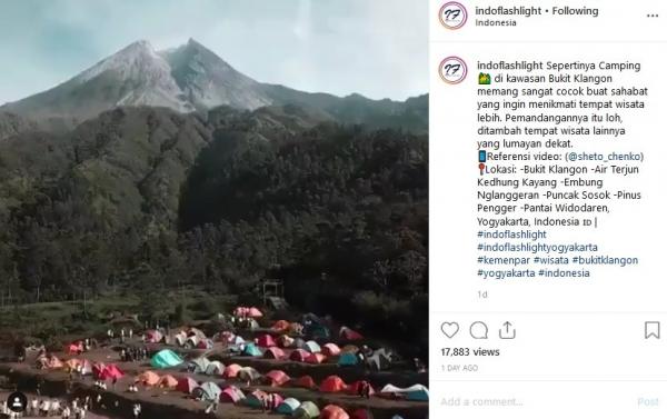 "Sepertinya camping di kawasan Bukit Klangon memang sangat cocok buat sahabat yang ingin menikmati tempat wisata lebih. Pemandangannya itu lho, ditambah tempat wisata lainnya yang lumayan dekat," tulis Instagram @Indoflashlight, dikutip Sabtu (15/6/2019).