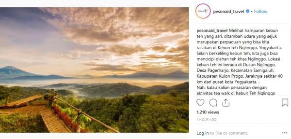 "Melihat hamparan kebun teh yang asri, ditambah udara yang sejuk merupakan perpaduan yang bisa kita rasakan di Kebun teh Nglinggo, Yogyakarta. Selain berkeliling kebun teh, kita juga bisa mencicipi olahan teh khas Nglinggo. Lokasi kebun teh ini berada di Dusun Nglinggo, Desa Pagerharjo, Kecamatan Samigaluh, Kabupaten Kulon Progo. Jaraknya sekitar 40 km dari pusat Kota Yogyakarta," tulis Instagram @Pesonaid_Travel, dikutip Rabu (19/12/2018).