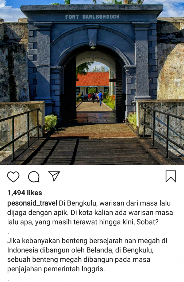"Di Bengkulu, warisan dari masa lalu dijaga dengan apik. Di kota kalian ada warisan masa lalu apa, yang masih terawat hingga kini? Jika sobat berkunjung ke kota Bengkulu, sangat sayang bila melewatkan kunjungan ke benteng Marlborough. Karena lokasinya yang berada di tengah kota dan tidak jauh dari pesisir Pantai Panjang," tulis Instagram @Pesonaid_travel, dikutip Senin (22/7/2019).