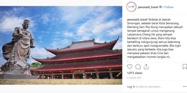 "Terletak di daerah Simongan, sebelah barat Kota Semarang. Klenteng Sam Poo Kong merupakan tempat bersejarah untuk mengenang Laksamana Cheng Ho yang sempat berlabuh di Utara Jawa. Di sini kita bisa berkeliling mengunjungi semua kelenteng dan berburu spot instagramable. Bila ingin sesuatu yang berbeda, kita juga bisa menyewa pakaian khas China dan mengabadikan momen langka ini. Di Sam Po Kong terdapat 4 kelenteng yang bisa kita kunjungi, yaitu Kelenteng Dewa Bumi, Kelenteng Juru Mudi, Kelenteng Sam Poo Tay Dijen, dan Kelenteng Kyai Jangkar. Yang mana menjadi favorit traveler?," tulis Instagram @Pesonaid_Travel, dikutip Senin (12/11/2018).