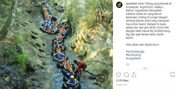 "Karst Tubing yang berada di Surobayan, Argomulyo, Sedayu, Bantul, Daerah Istimewa Yogyakarta ini merupakan wahana wisata air yang penuh keceriaan. Tubing di sungai dengan dinding batuan karst yang menawan. Ayo dolan ke sini. Tempat ini buka setiap hari mulai pukul 08.00 hingga pukul16.00 WIB. Tiket masuknya Rp30.000 per orang. Tag dan ajak teman kamu dolan ke sini, ya! Foto dolan dari @iketutwuri," tulis Instagram @ayodolan, Kamis (15/8/2019).