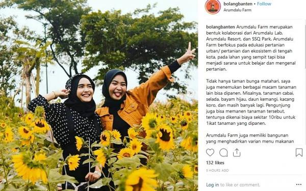 "Arumdalu Farm merupakan bentuk kolaborasi dari Arumdalu Lab, Arumdalu Resort, dan SSQ Park. Arumdalu Farm berfokus pada edukasi pertanian urban/ pertanian dan ekosistem di tengah kota, pada lahan yang sempit tapi bisa menjadi sarana untuk belajar dan mengenal pertanian. Tidak hanya taman bunga matahari, saya juga menemukan berbagai macam tanaman lain bisa dipanen. Misalnya, tanaman cabai, selada, bayam hijau, daun kemangi, kacang koro, dan masih banyak lagi. Pengunjung juga bisa memanen tanaman tersebut, tentunya dikenai biaya sekitar Rp10.000 untuk 1 ikat tanaman yang dipanen. Arumdalu Farm juga memiliki bangunan yang menghadirkan varian menu makanan sehat yang bahan-bahannya dipanen langsung dari lahan yang ada. Menu yang saya coba, yaitu Magic Blue Pea Tea dan Tempeh Burger," tulis Instagram @bolangbanten, dikutip Kamis (25/10/2018).