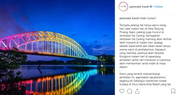 "Indah, bukan? Siapa pun yang melintas, pastinya akan terpikat. Kongkow malam hari di sepanjang jembatan cantik nan menawan ini pastinya akan memberikan cerita indah di masa depan. Kamu yang tertarik menyambangi jembatan ini, agendakan perjalananmu segera, yuk! Sekaligus menikmati wisata budaya di Situs Istana Kota Rebah yang tak jauh dari lokasi jembatan ini," tulis Instagram @pesonaid_travel, Kamis (16/5/2019).