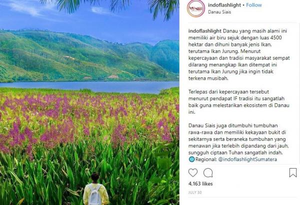"Danau yang masih alami ini memiliki air biru sejuk dengan luas 4.500 hektare dan dihuni banyak jenis Ikan, terutama Ikan Jurung. Menurut kepercayaan dan tradisi, masyarakat dilarang menangkap ikan di tempat ini terutama Ikan Jurung jika tidak ingin terkena musibah. Terlepas dari kepercayaan tersebut menurut pendapat IF tradisi itu sangatlah baik guna melestarikan ekosistem di danau ini. Danau Siais juga ditumbuhi tumbuhan rawa-rawa dan memiliki kekayaan bukit di sekitarnya serta beraneka tumbuhan yang menawan jika terlebih dipandang dari jauh, sungguh ciptaan Tuhan sangatlah indah," tulis Instagram @Indoflashlight dikutip iNews.id, Senin (13/8/2018).