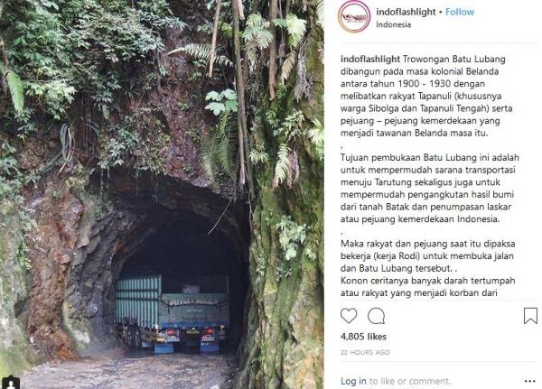 "Terowongan Batu Lubang dibangun pada masa kolonial Belanda antara 1900 - 1930 dengan melibatkan rakyat Tapanuli (khususnya warga Sibolga dan Tapanuli Tengah) serta pejuang-pejuang kemerdekaan yang menjadi tawanan Belanda masa itu. Tujuan pembukaan Batu Lubang ini adalah untuk mempermudah sarana transportasi menuju Tarutung sekaligus juga untuk mempermudah pengangkutan hasil bumi dari tanah Batak dan penumpasan laskar atau pejuang kemerdekaan Indonesia. Maka rakyat dan pejuang saat itu dipaksa bekerja (kerja Rodi) untuk membuka jalan dan Batu Lubang tersebut. Konon ceritanya banyak darah tertumpah atau rakyat yang menjadi korban dari pekerjaan pembukaan jalan dan Batu Lubang itu, terutama pada pembukaan jalan pada terowongan," tulis Instagram @indoflashlight, dikutip Sabtu (11/8/2018).